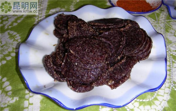 在納西語(yǔ)里稱作“麻補(bǔ)”。把大米或糯米蒸熟后,拌在新鮮豬血、蛋清及各種香料里,然后灌到洗凈的大腸內(nèi),封好蒸熟而成。麗江古城的小飯館里有這道菜。