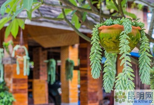 院子里種滿了各種當?shù)刂参铮钗俗⒛康谋闶堑躔B(yǎng)在門口和門廊上的多肉植物,在花盆里吊下一串串飽滿又可愛的肉肉,非常討人喜歡。